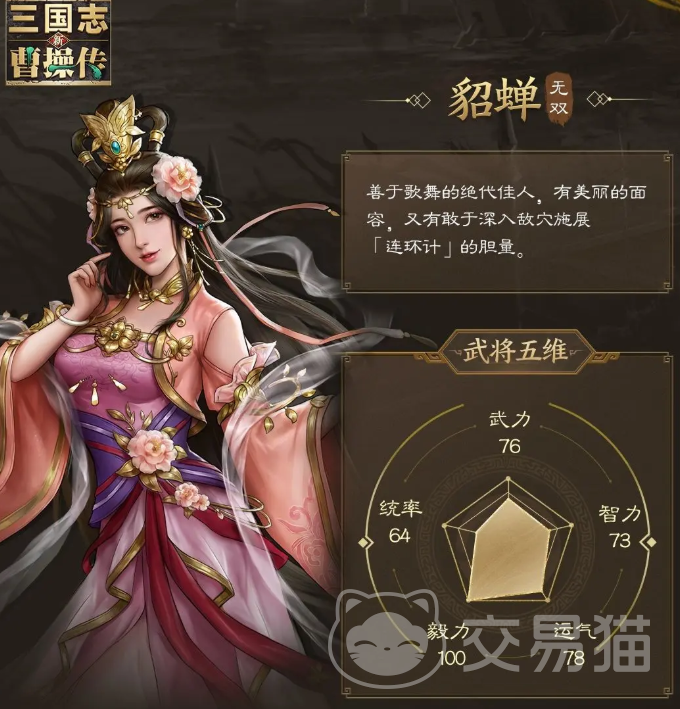 貂蝉的兵种是倾城,可以让自己的攻击力附加到精神上,适合在船上和沼泽中作战,她的天赋是让自己的最大生命提升,并在战斗开始时选择攻击力最高的队友,获得其20%攻击的精神,并给予他自己20%精神的攻击,回合开始时恢复周边两圈范围内队友的生命,并清除两个减益,她的“诱惑之舞”会造成145%谋略伤害,并对目标施加“离间”,让其失去所有操作能力,只能随机攻击自己队友,最后让目标防御和韧性都降低40%;