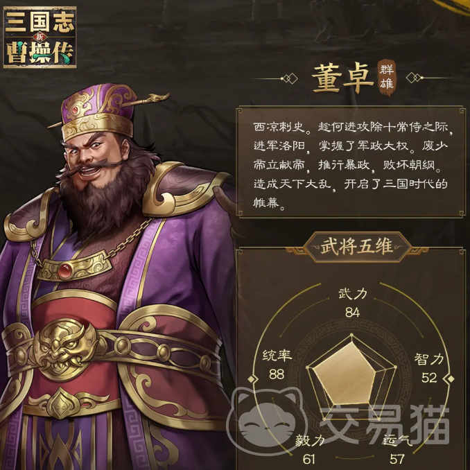 董卓是兼具防御和攻击的玄甲军,能有效阻挡敌人进攻构建坚固的防御阵地,他的被动是让最大生命上升,自身不遭受骑兵的克制,在每次行动结束后若周围一圈范围内有敌人,则扣除自己少量生命,对该范围内所有敌人造成真伤,并施加上会在行动结束后造成伤害的流血,他的“逆乱”会造成中量伤害,攻击的目标身上每有1层减益,就恢复自身一定生命,他的“虐衅天下”会对自身两圈范围内所有敌人大概率施加嘲讽1回合,攻击目标身上每有1个减益就会让成功概率提升,他的怒气技会在造成少量伤害后,回复自身超多生命值,并再次对目标造成自身一定生命比例的真伤。