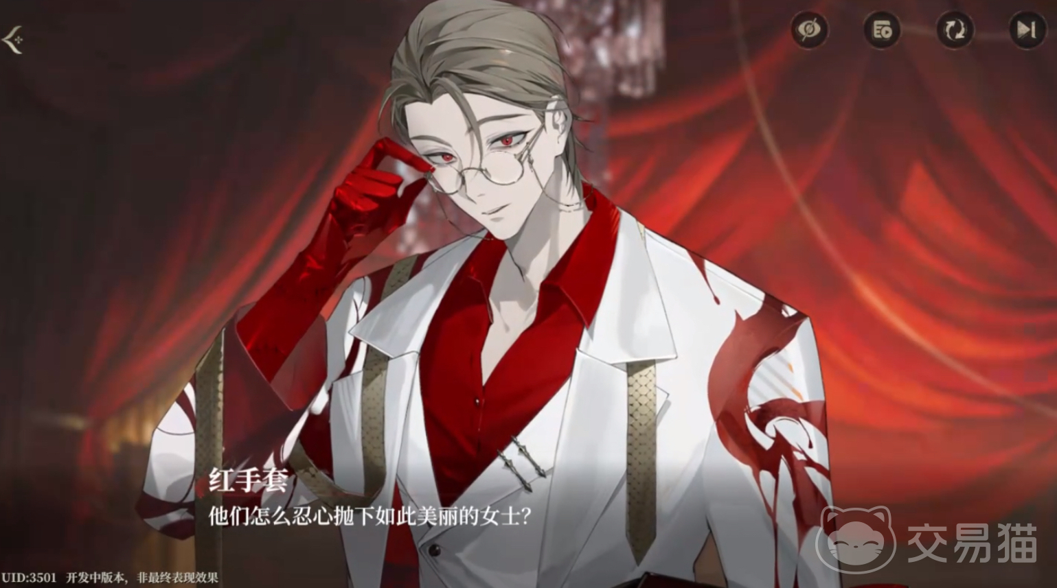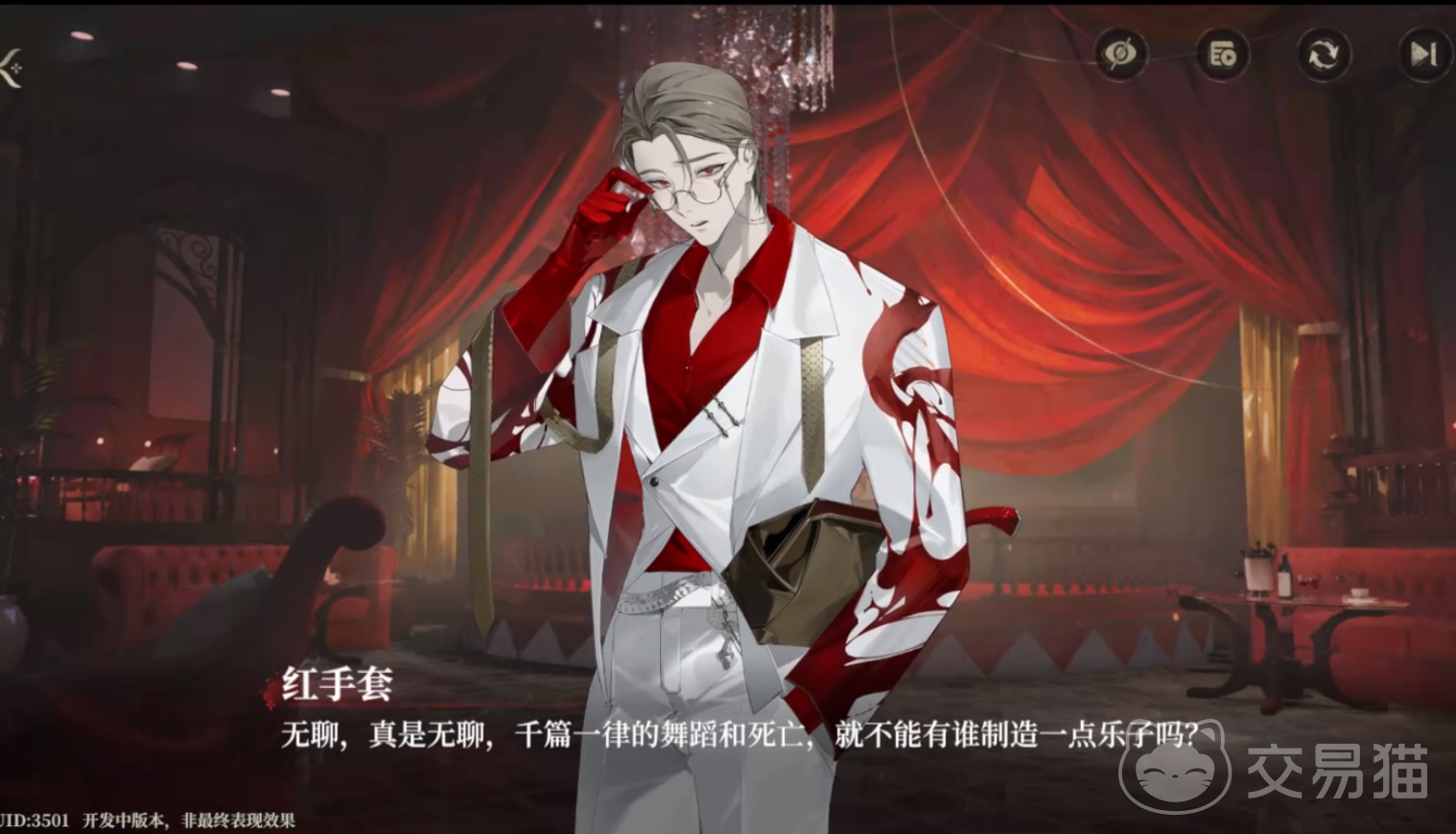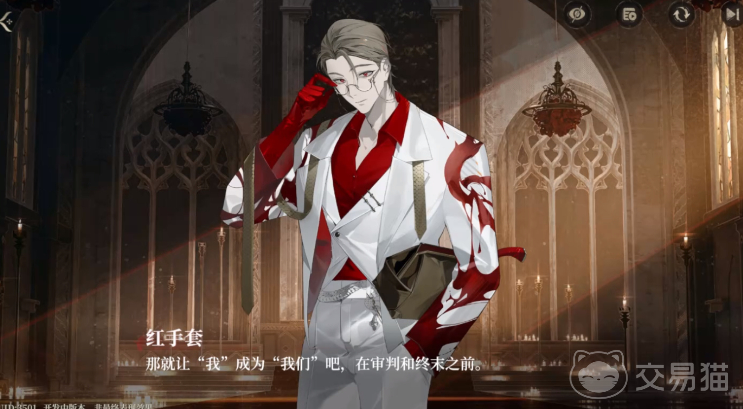 红手套在游戏中的形象是非常突出的,他的标志就是一双红手套。他的职业是一名律师,表面西装革履,相貌堂堂,心理却十分扭曲,喜欢追求刺激,极具反差感。红手套偏好曼陀罗信息素,喜欢刺激的玩家可以选择攻略他,不过对话要谨慎选择以免触发负面事件。