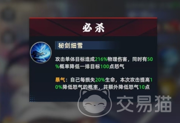 更为关键的是在战斗一开始,橘右京会立即获得600点额外怒气,使得他在开战之后就能够迅速进入状态,橘右京的必杀技能专门用于攻击单体目标,当它命中敌人时,不仅会造成可观的物理伤害,而且在暴击的状态下,还存在着一个极为独特的效果,那就是随着橘右京自身每损失20%的生命值,他就能够提高10%降低怒气的几率。