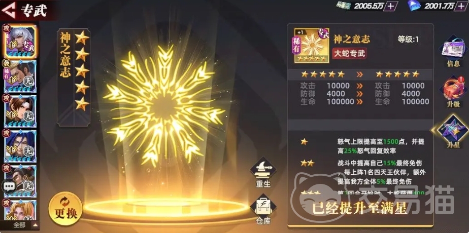 大蛇的专武神之意志,当大蛇穿戴该专武后,它的怒气上限得到了提升,同时怒气回复效率也大幅增加,这使得大蛇能够更快地积攒怒气,这种专武的效果与大蛇的羁绊效果相互配合,进一步加快了大蛇技能释放的频率,并且随着专武不断地升星,还会附加免伤效果,这一效果的出现,极大地提升了大蛇的生存能力,原本就输出恐怖的大蛇,在拥有了免伤属性之后,变得更加难以针对。
