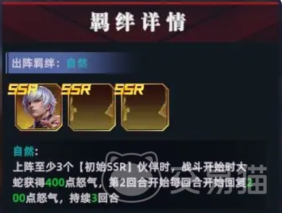 在战斗过程中,大蛇强大的能量波动还是很厉害的,敌方无人能够逃脱,然而要想激活大蛇那强大的羁绊效果,条件也有一点严苛,需要同时上阵另外两个SSR品质的同伴,但是一旦成功达成这一条件,所带来的收益绝对是巨大的,当羁绊激活之后,大蛇会立即获得400怒气,这意味着它能够在开局就毫不犹豫地释放威力强大的怒气技能,直接突袭敌方。