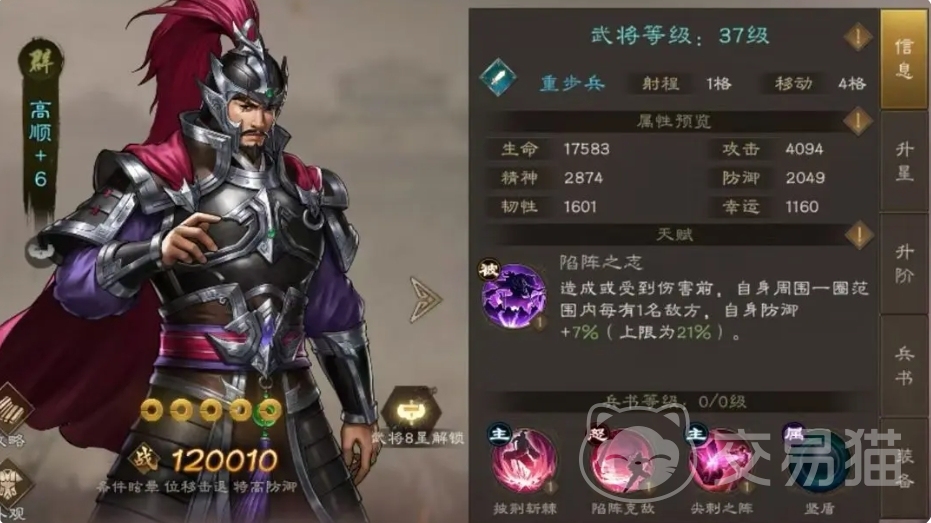 最后不得不提的是高顺,高顺的最大特色在于其独一无二的击退能力,他的一二技能皆具备击退敌方的能力,凭借这一能力,高顺能够巧妙地打乱敌方的防守布局,将敌方武将从营地中驱逐出来,使其失去营地这一天然的防御优势,而且高顺本身的实力也有一定的攻击力,他可以利用自己独特的技能机制进行有效暑促胡,如果能够得到玩家的合理培养与运用,高顺必将成为一位极具潜力的特色武将。