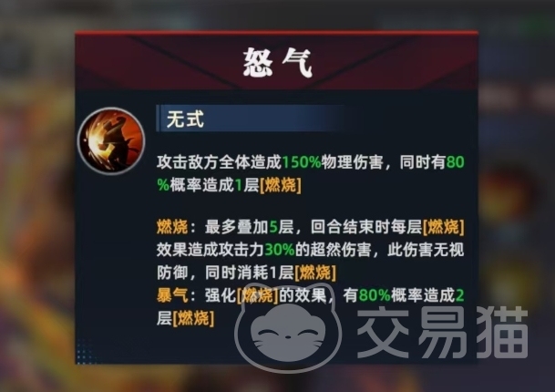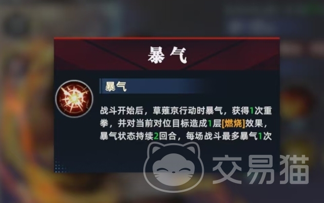 草薙京在游戏中属于SSR品质的攻击型选手,他的自身定位十分明确,具有超强的输出能力,同时还附带燃烧以及燃烧增强的额外效果,这既能给予敌人高额的伤害,又能通过燃烧效果持续消耗敌人的生命值,在战斗开局时,草薙京便展现出了其独特的优势,他能够立即获得600点额外怒气,这一机制使得他在短回合内就能够迅速积攒足够的怒气,从而打出前期就很高的爆发输出。