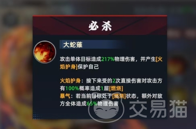 这种开局即爆发的爆气机制,让草薙京在战斗初期就能够迅速建立起优势,接下来草薙京的技能特点中,大家要知道他的必杀技效果是单体攻击,能够精准地攻击单体目标,并造成高额的物理伤害,在造成伤害的同时,还能获得火焰护身的保护,这一火焰护身具有独特的反击机制,在火焰护身的影响下,接下来受到的两次直接伤害,会对攻击目标造成一层燃烧效果,也就是说,当敌人试图攻击草薙京时,很可能被自己的攻击所反噬。