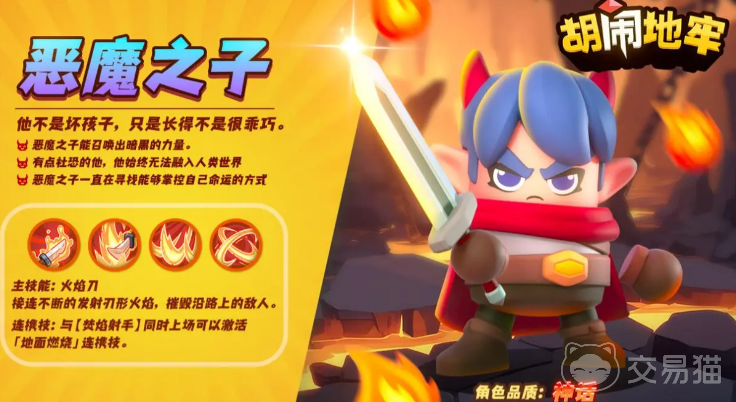 恶魔之子诞生在幽深晦暗的地下深处,火焰是他力量的源泉,拥有焚毁一切的能力,他的主技能“火焰刀”会不断发射出刀刃形的火焰,摧毁沿路的敌人,技能伤害高且有一定范围,能帮助应对不少敌人。