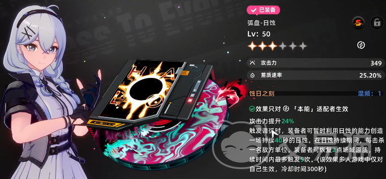 日蚀是能掌控黑暗能量的武器,它只适配本能角色,能让攻击力提升24%,装备者每次触发调弧技时,会创造出持续40秒的日蚀,在日蚀的持续期间内,每成功击杀掉一位敌人,就能恢复自身2点场域原质;