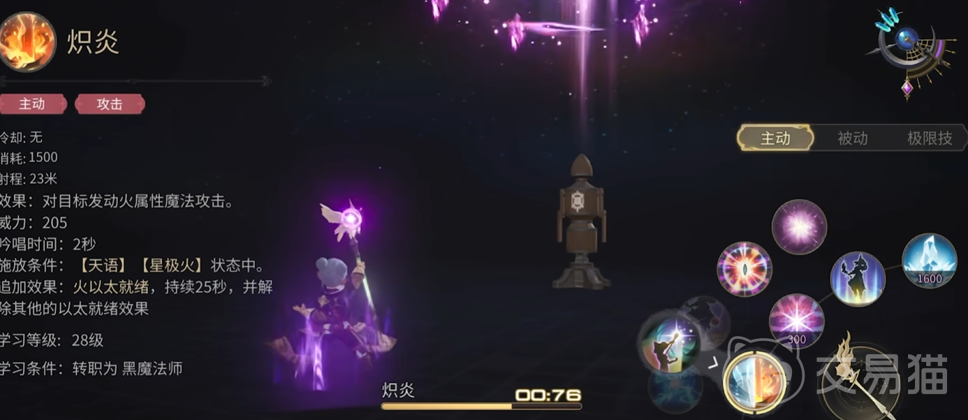 爆炎:对目标及其周围敌人发动火属性范围魔法攻击,并获得最大层数的 “星极火” 效果。“星极火” 下,火属性魔法的消耗魔力增加至 2 倍,但威力提升至 1.4/1.6/1.8 倍,冰属性魔法的消耗魔力减少至 0.25 倍,威力降低至 0.9/0.8/0.7 倍。该技能是黑魔在火属性输出循环中的重要起手技能,开启高伤害的火属性模式。
