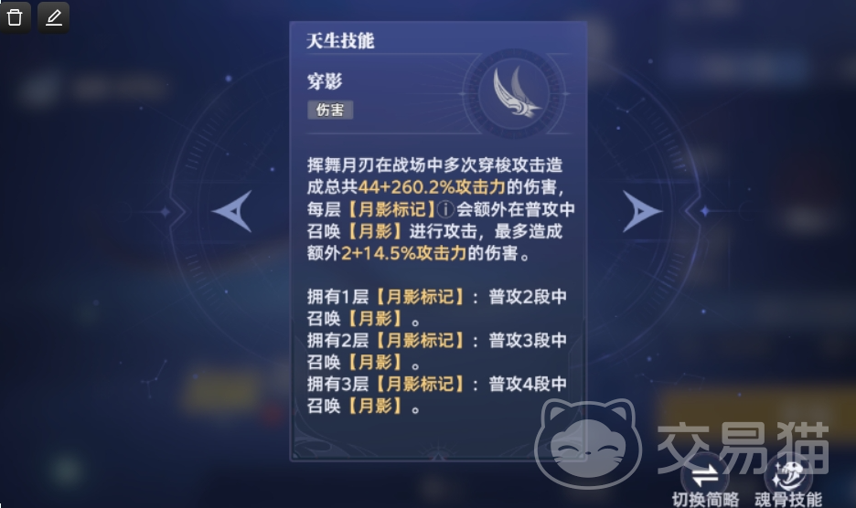 邪月的技能丰富多样,天生技能“穿影”,可以打出多次的伤害,并且可以累加月影标记的层数去增加伤害,最多三层。而“圆月破袭”和第一魂环技能都为邪月提供了位移的能力,前者能够向目标敌人突进并打出斩击伤害,这就让他在战场上能够更加灵活,也有了追击收割的能力;后者则是再打出高伤害的同时还可叠加可观的重伤效果,并且第三魂环技能依然属于重伤伤害。