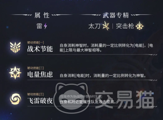 飞雷破夜这就是一个被动技能,可以迅速的提升辅警雷属性队友又或者是自身攻击力。可以强化雷系输出体系,另外同属性在搭配之后还是比较厉害的。