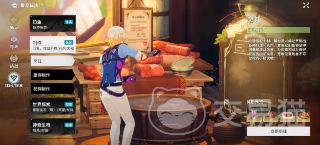 休闲探索玩法中的钓鱼,开放时间是全天,推荐单人参与,此类玩法当中还有烹饪玩法也颇具趣味,玩家需要合理搭配主材、辅材,才能成功烹制出各种料理和药剂,这些料理和药剂食用它们能够获得回复和增益效果,所以在探索和战斗之前,好好研究一下烹饪技巧,为自己准备充足的战前补给,也是一个小秘诀,最后的神奇生物玩法开放时间是全天,推荐单人参与。