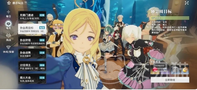 司弟门遗迹作为经典副本,必须要多人参与,但是很好的一点是这里随机组队很方便,而且司第门遗迹的奖励每两周重置一次,每次都有新的惊喜等待着大家。协会周目标玩法开放时间是全天,推荐单人参与,玩家加入协会后,就可以和协会成员们一起完成每周共同的目标。