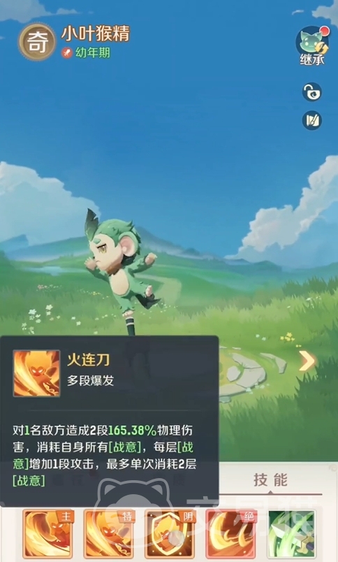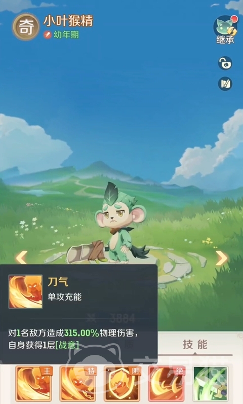 小叶猴精有着很高的物攻倍率,定位为单体爆发,通常被作为物攻输出宠使用,前期若是能拿到它,开荒会变得非常的简单。其一技能刀气为充能技,可在打出夸张物攻倍率的同时,为自身叠加一层战意,是小叶猴精的主要技能之一,不管玩家往后给小叶猴精打上什么技能,刀气都必带。