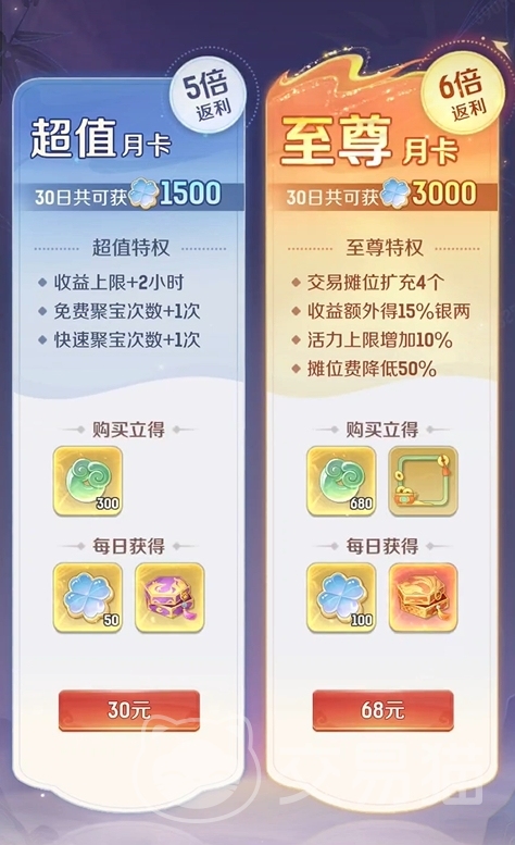 首先,灵兽大冒险的氪金回报主要集中在资源上,其中月卡是性价比最高的氪金方式,比较适合微氪玩家。目前游戏共有超值月卡(30元)和至尊月卡(68元)两种,它们互相独立,且所赠送的权益也都不一样。同时,游戏还开放了战令,玩家购买后可根据完成战令任务的数量,获得更多额外的资源收益。