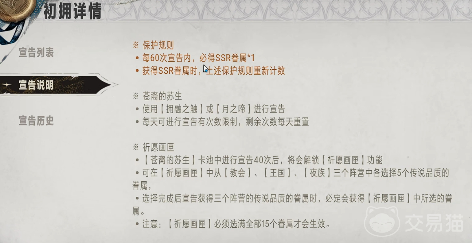 此外,公测后玩家在常驻池的抽卡次数分别达到150次、300次时,都能获得道具夜眷棺椁,使用后可从常驻SSR中自选一名角色,但要注意该自选不能选择始祖阵营势力中的SSR角色。若抽卡次数达到450次,可从始祖棺椁中选一名始祖势力SSR角色。