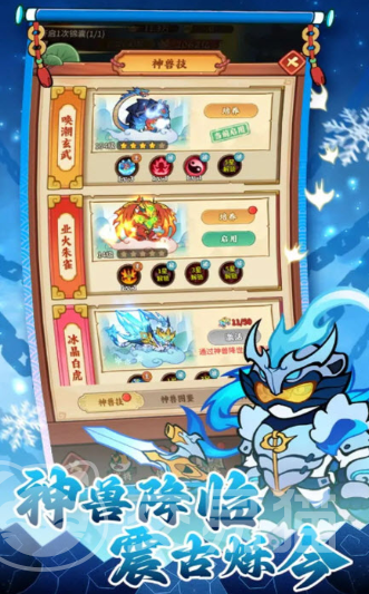 游戏内近百位三国名将悉数登场,每位名将拥有兽形、人形、狂暴形等多种形态,兽形是初始形态,依据名将性格化为不同野兽,通过特定方式,可让名将恢复人形,解锁更多能力,而狂暴形作为最终形态战斗力爆表,属性大幅增强,收集养成不同形态的名将,组建自己的强力军团,是游戏一大乐趣,战斗采用回合制,玩家需根据武将技能、职业特性进行排兵布阵,职业分为攻击、防御和辅助型,合理搭配才能组建最强队伍。比如
