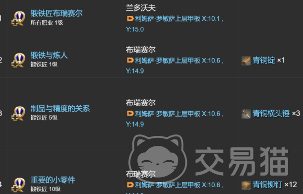 刚开始时,做任何东西都是提升等级的好办法。通过制作大量低级装备、工具,你的锻铁匠等级会不断攀升。尤其是到了15级,你会发现有一些物品可以制作起来简单又高效,比如黑铁锭和黑铁铆钉。这些简单的基础物品,一路做下去,就能稳步提升到30级。