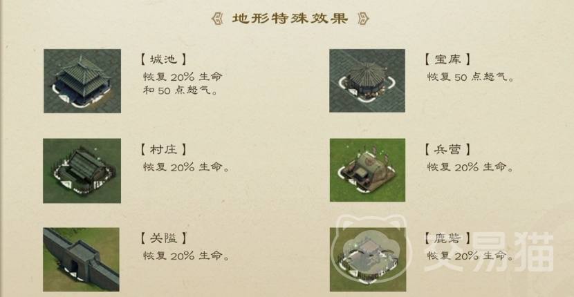 地形除了有克制关系之外,也有不同程度和内容的增益效果,因此在对战前不妨再考虑下地形的增益效果,每个地形的增益不同,具体效果如图所示。玩家可以在发起进攻时,尽量选择【城池】、【宝库】这样的地形,因为有增加怒气值的效果,怒气值能提升兵力。