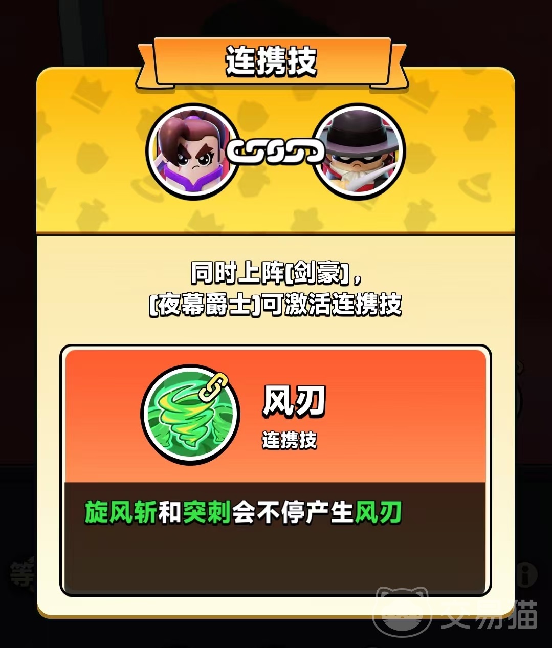 旋风斩的天赋是需要突破星级才能解锁,达到一星时可以释放暴风斩,后续还有吸附附近的敌人,暴风斩必然暴击,以及发射剑风附带跟踪效果等一系列技能特点。另外还有一个技能是被动效果可以提高全队防御,只要上阵就能生效,这也使得剑豪有了成为团队核心的能力。剑豪还有一个连携技能是风刃,需要和夜幕爵士一起激活才可以出发。使得旋风斩和突刺会不断产生风刃,清理小怪能力进一步加强。