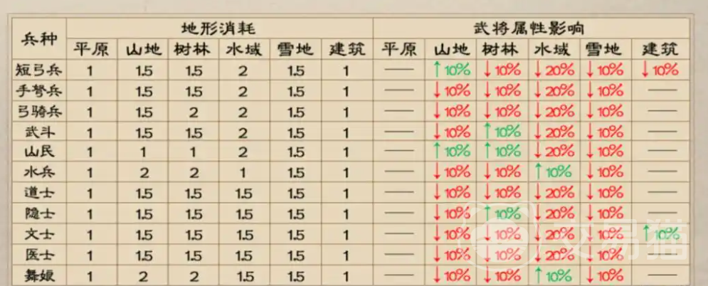 除了兵种克制以外,游戏中另一个影响兵种发挥的因素就是地形了。像平原地形中,大部分骑兵的属性会获得小幅的提升。而在山地中,大部分兵种的属性或多或少都有所下降,不过短弓兵的属性却有小幅的提升,大家在遇到山地地形的时候,可以让短弓兵打头阵。而在树林、水域、雪地等地形中,不同兵种各自受到的影响也各不相同,玩家需要根据地形来决定出战的兵种。