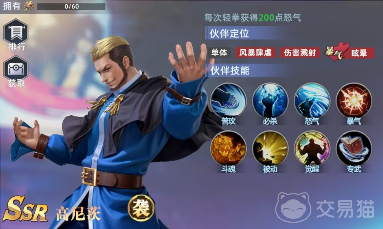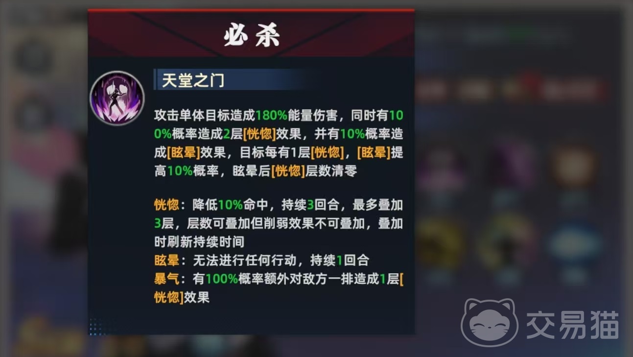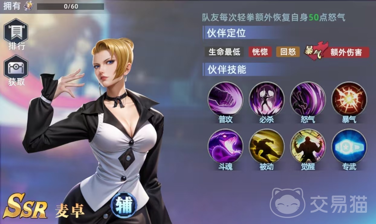 麦卓在第二回合开始行动时就能触发爆气,提升我方10%攻击力,持续两回合。爆气效果是属于全队性质,对于整个队伍的输出都有着明显加强,尤其是那些在开局就有爆发的格斗家,更是适合和麦卓一起组队。必杀技可以攻击单体目标,同时有几率造成恍惚效果和眩晕效果,对方身上每带有一层恍惚,眩晕的概率就能提高10%。