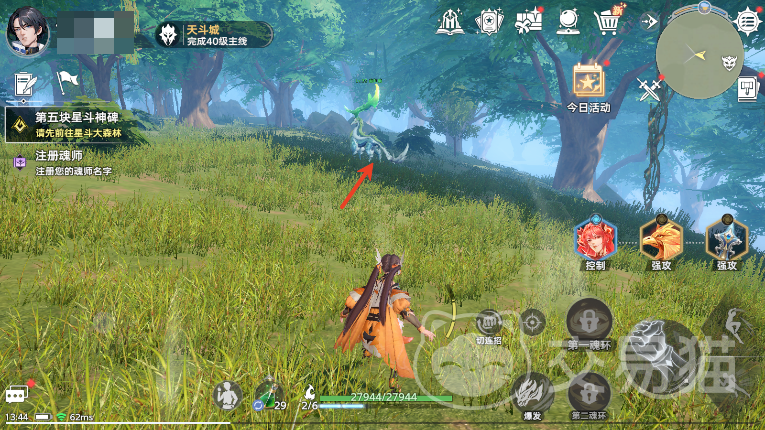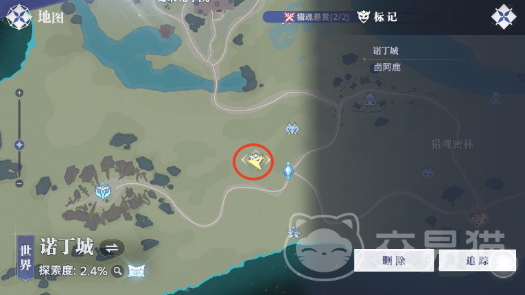 第一只是在诺丁城地图左下角,如图所示“密林西部”传送点的左侧,给大家画了一个标记,追踪这个标记的方向就能找到这只鹿了,体型很大的绿色鹿,在树林里还是能轻松发现的,击杀掉卤阿鹿之后会掉落3张武魂觉醒券。