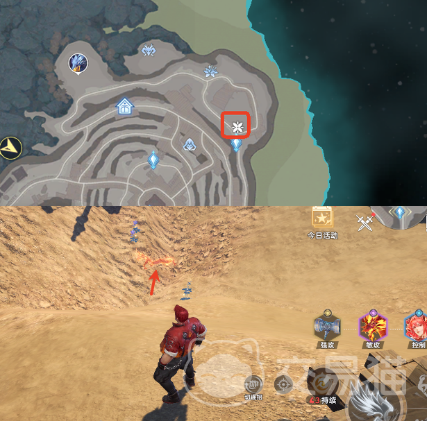 第六处是在地图最右侧的矿藏区,传送点落地后掉头向着矿坑内走,滑下去就可以看到火龙,这里还有一些植物材料可以顺带采集下。