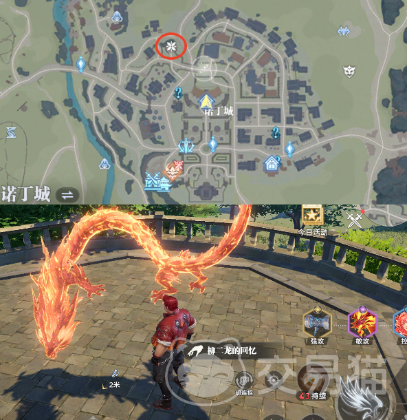 柳二龙的回忆碎片一共有6个,第一个是在诺丁城主城的左上角,如图所示可以看到一处圆台,这里用花图案给大家标记了,靠近后可以看到有一条火龙靠近互动就可以收集这个回忆。