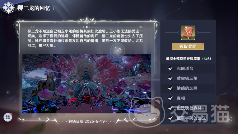 至此斗罗大陆猎魂世界魂师篇章探索之柳二龙篇就结束了,收集这6个回忆之就可以在设置-魂师篇章中解锁柳二龙回忆的名字,6个回忆全部解锁就可以获得武魂觉醒券奖励了。