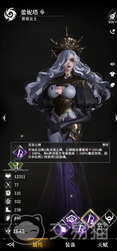 她是强大的法术爆发角色,在场时能一人打出两份伤害,并且还能不断让输出越来越高,她的被动“灵语之碑”会在开场的时候召唤一个石碑,石碑会每6秒对单体敌人造成100%魔法伤害,敌人在阵亡时能让自己获得一层汲取,汲取会提升自身5%伤害,最多可提升60%,她的普攻会对目标造成962点法伤,她的能量技会召唤出愤怒的荒魂,对目标及相邻的敌人造成法伤。
