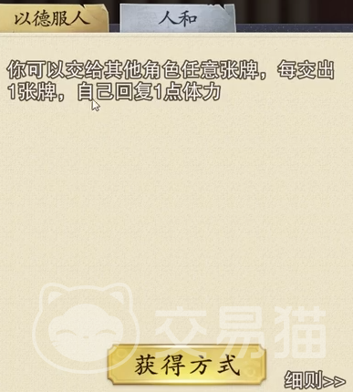 这是目前游戏中另一个T0的武将,这位所属的阵营是蜀。在游戏里面出现在主公这个身份的可选武将是比较常见的。刘备本身的血量不算低,最大的时候是拥有5点生命值,再加上他自身的保命能力非常的强,所以基本上玩得好的话是很难出现重伤的情况发生。他本身的技能一共有两个,第一个是以德服人,第二个则是人和。我们先说第一个技能,这个技能是让我们可以交给其他的玩家任意卡牌,同时不限张数,每交出一张牌,那么就可以恢复自己一点体力,这个治疗能力可以让我们保命变强。