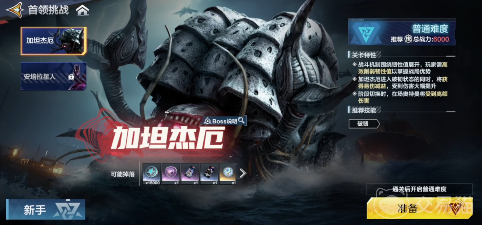 点击进去之后,就会出现大家可以挑战的两个首领。第二个首领想要大家击败上一个首领之后才能解锁,所以大家可以先看首个boss—加坦杰厄。这个关卡推荐大家战力达到6000之后再挑战,所以玩家可先从角色、装备等方面入手提升个人战力。