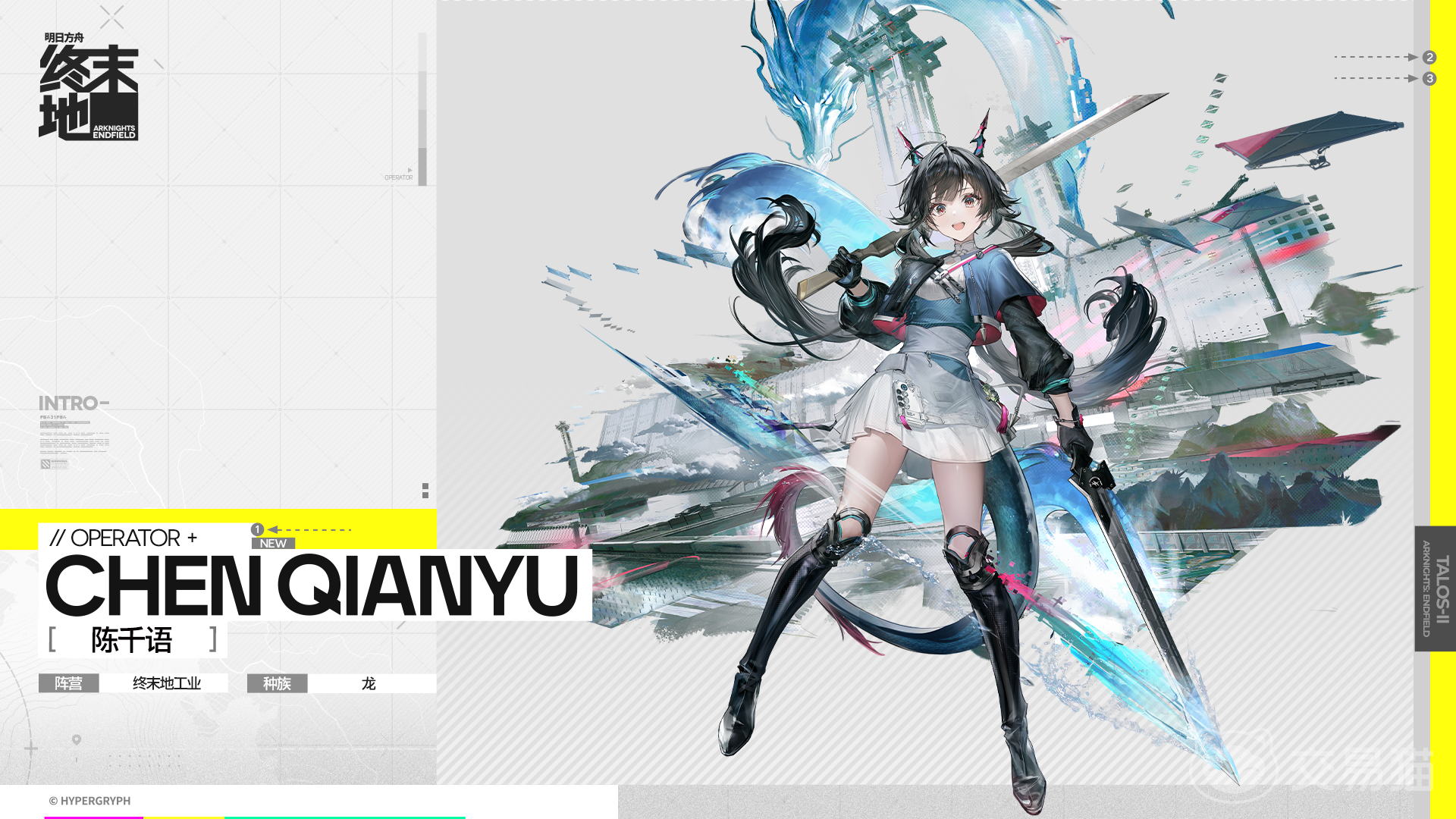 在游戏定位中是一位具有稳定输出的特勤,拥有着真龙特征的外貌,通过持久生存能力可拉长战斗。技能由追击、归穹宇和冽风霜组成,追击可将普攻增强到180%的攻击效果,归穹宇带来的位移,不仅能躲避敌人攻击,还可闪现到敌人面前释放物理伤害和击飞,搭配破刃就可造成结晶强化伤害。冽风霜可对敌人造成八次击杀和击飞效果。