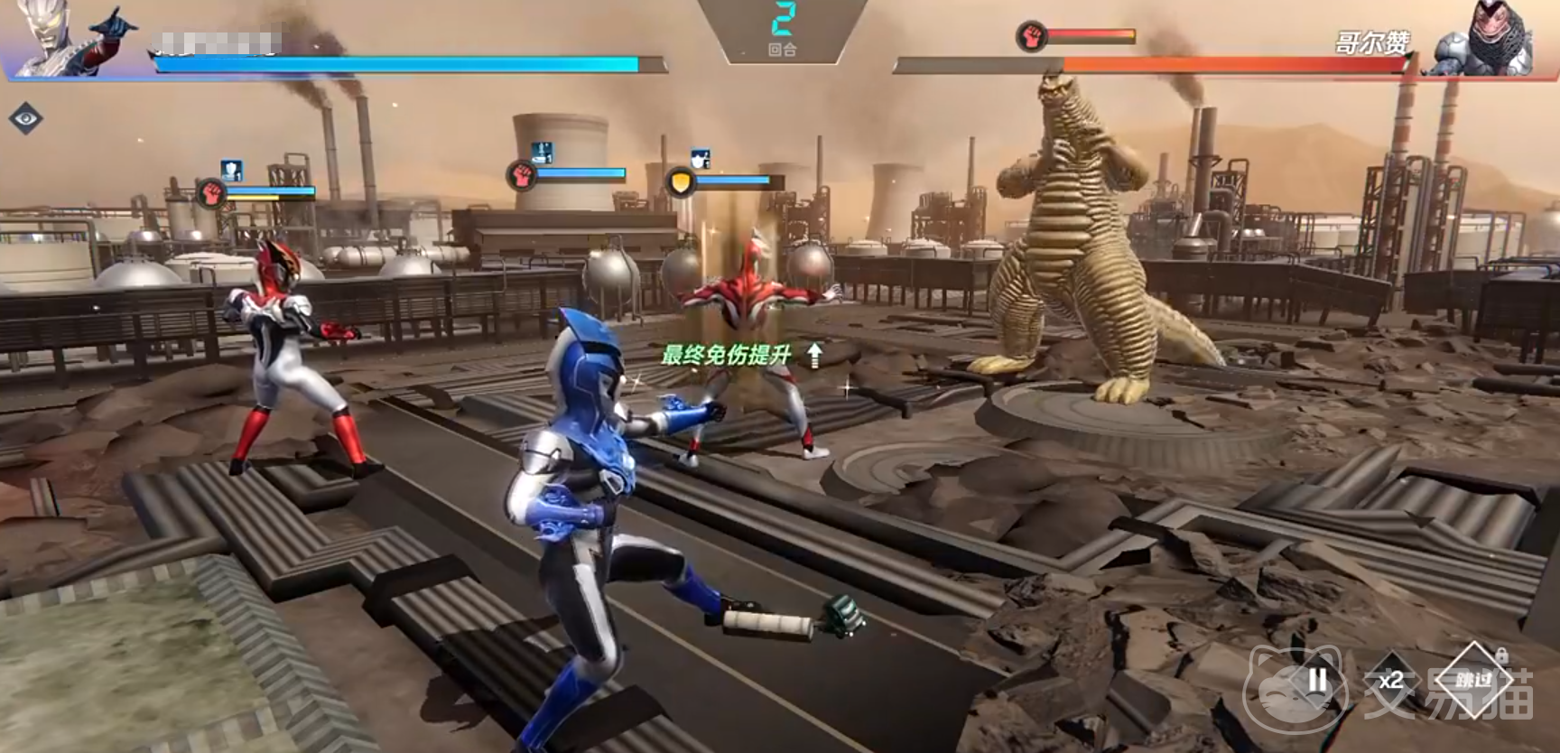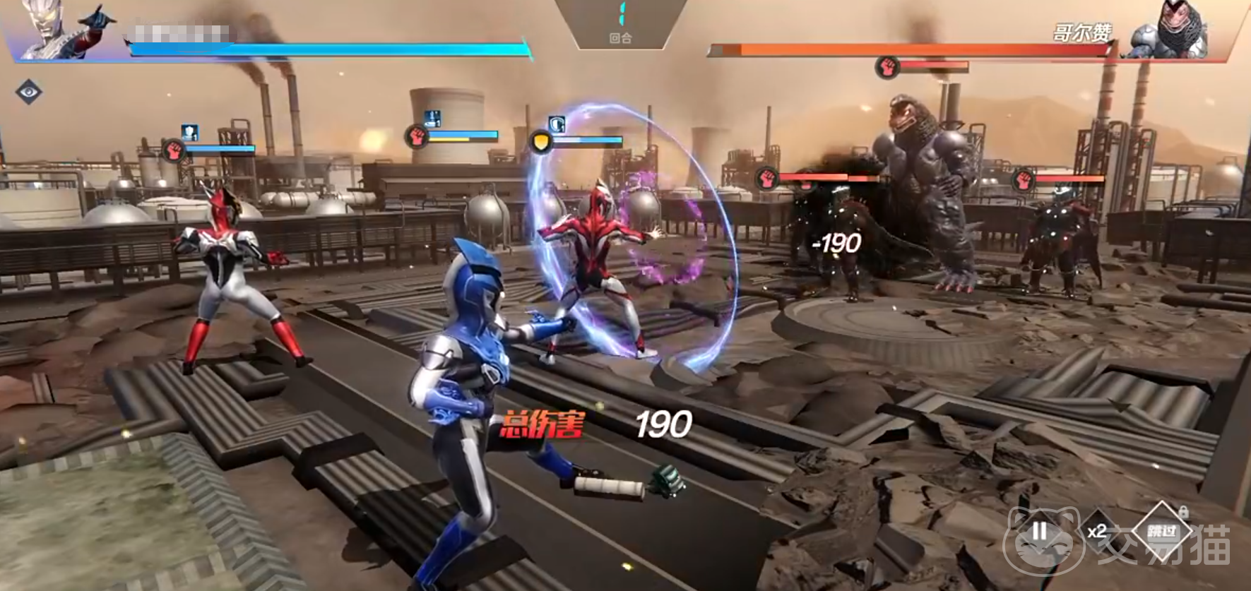 之后输出能量满了即可开启大招,例如雷欧就可放出毁灭爆裂,这样就能一次攻击多个对手。若是大家觉得动画太长了的话,也可直接跳过,不过前期主线无法跳过。当小怪阵亡后,哥尔赞也开始用出自己的真正实力,并且浑身都变成了黄色,仿佛想要为小弟找回场子。