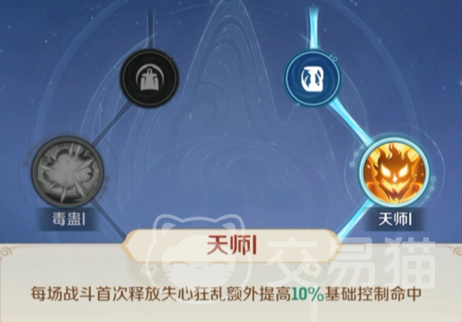 接着建议各位点右边的天赋,可以点一级天师。首次释放失心狂乱提高可以提升10%的命中率。这招可以强化控制能力,影响4个目标,所以这样能进一步提升控制率。搭配上四面楚歌,就能一起手就控制住对方几乎所有的人。