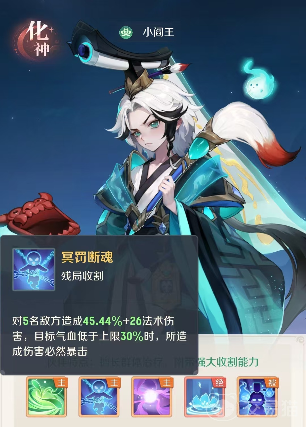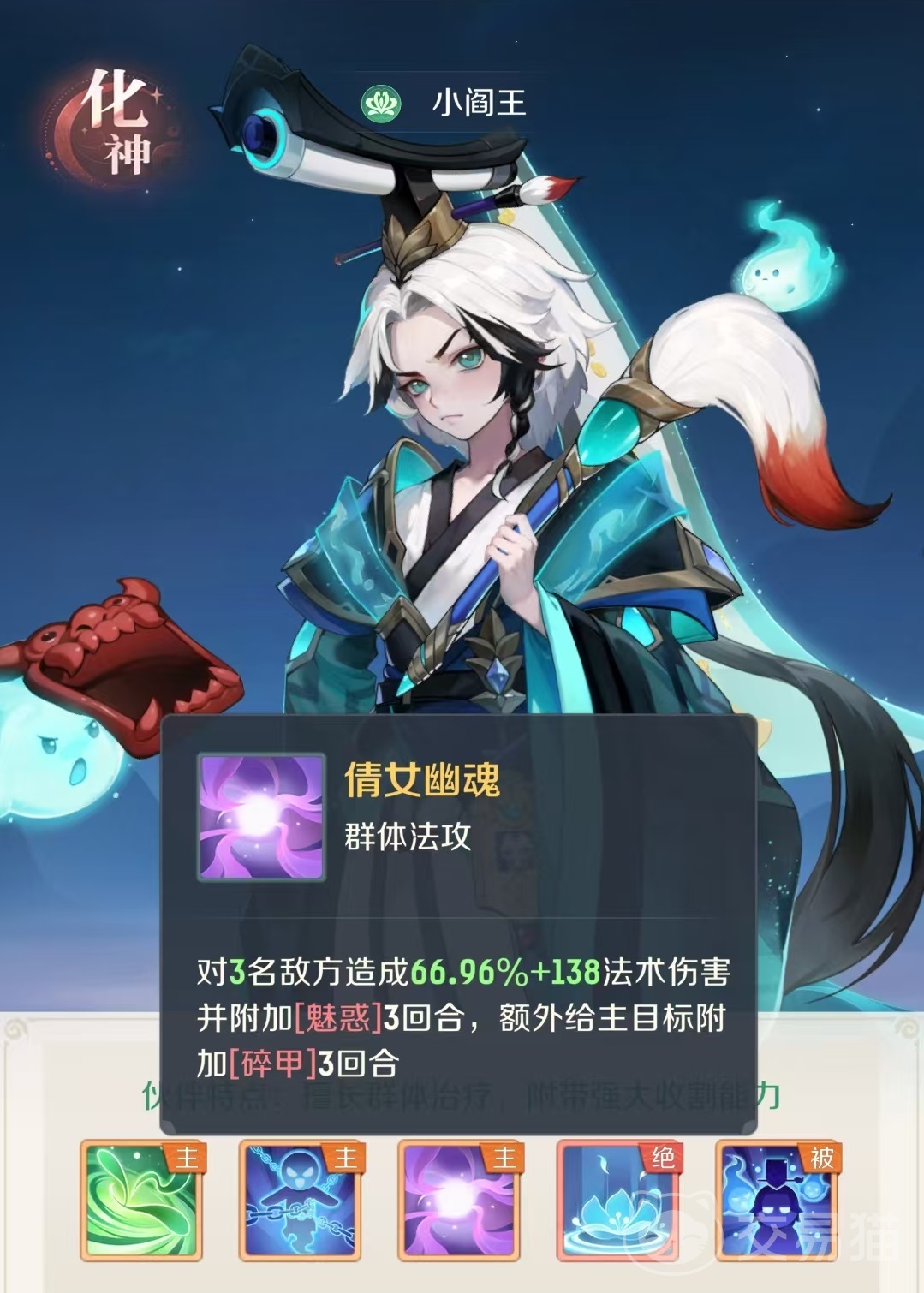 第2个技能冥罚断魂,对5名敌方单位造成法术伤害,如果目标当前的血量低于30%上限,所造成的伤害必定会触发暴击。这是一个很好用的残局收割技能,只要其他的伙伴可以将对方的血线打下来,小阎王利用自身的高伤害和暴击,就可以做到收割。第3个技能倩女幽魂,是群体法攻类型的效果,对三名敌人造成法术伤害,并附加三回合的魅惑,额外给技能的主目标施加碎甲,持续三回合。这个技能的伤害并不算可观,但是附加的魅惑是很好的控制。