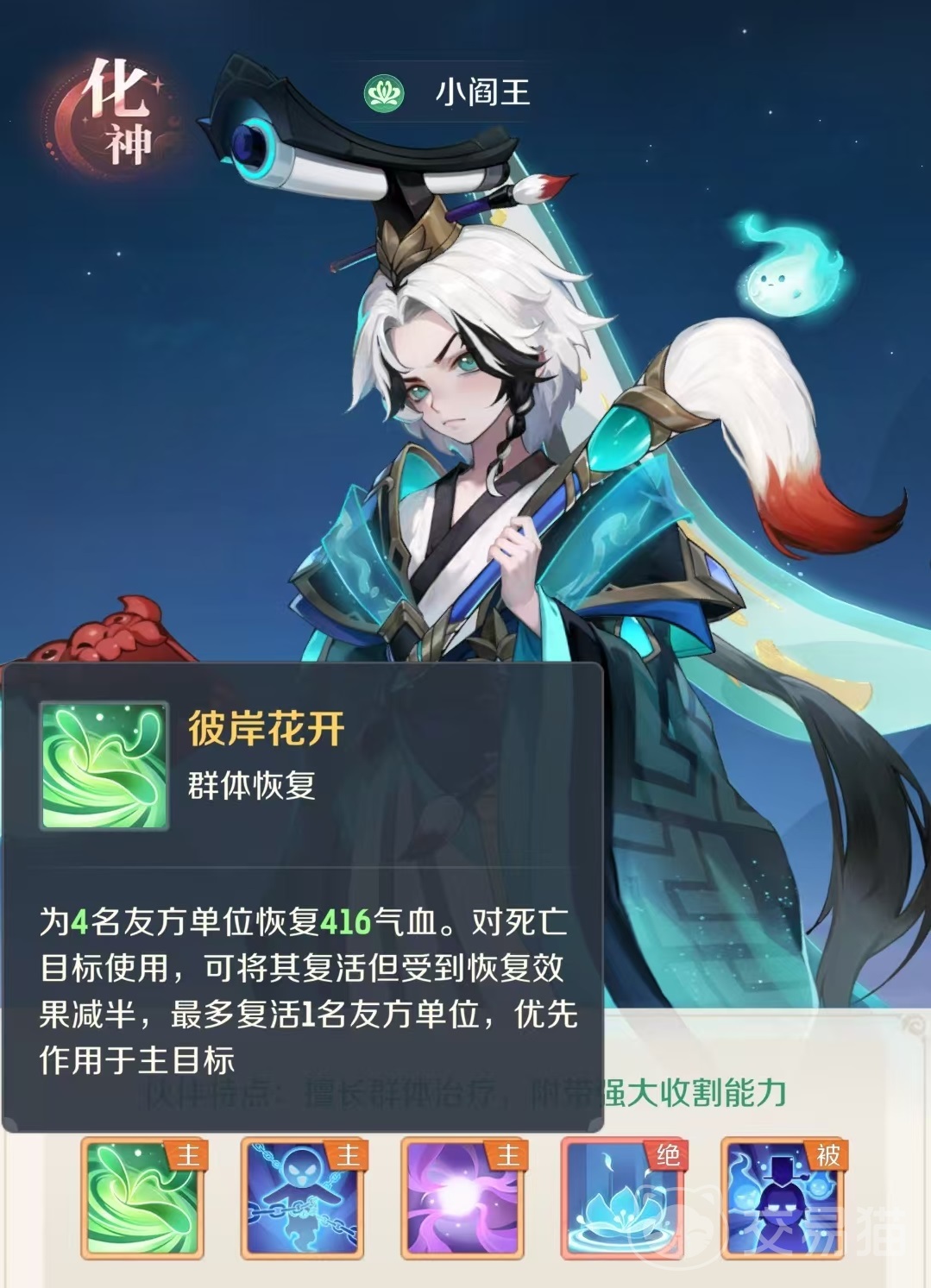 在游戏中,小阎王是属于化神期的顶级伙伴之一,自身拥有诸多主动技能和绝招以及被动,擅长群体治疗并附带强大的收割能力。主动技能彼岸花开,群体恢复效果,能够为4名友方单位恢复血量,对死亡目标使用时可将其复活,但是加血效果减半。最多复活一名友方单位,使用之后优先作用于主目标。