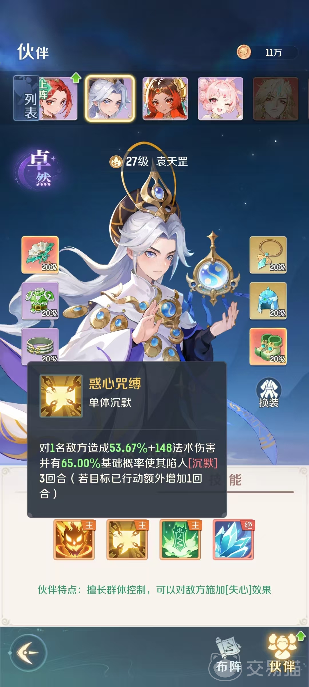 看到这里大家就了解清楚灵兽大冒险袁天罡怎么玩了吧,在进行阵容搭配的时候,袁天罡以出色的控制能力,是经常出战的伙伴。在搭配上其他的输出,这样就可以针对很多战斗了,只要主角没有控制效果,袁天罡就非常有用。