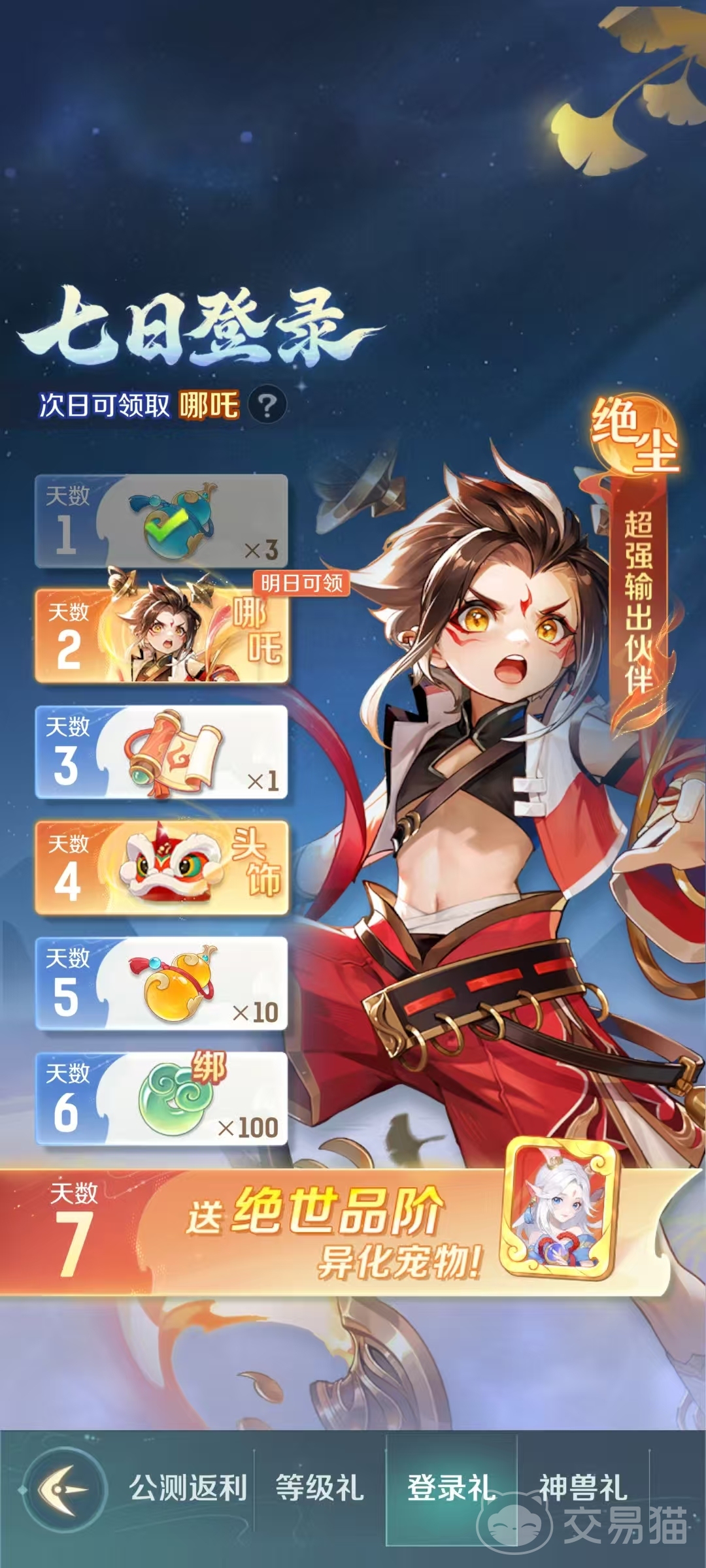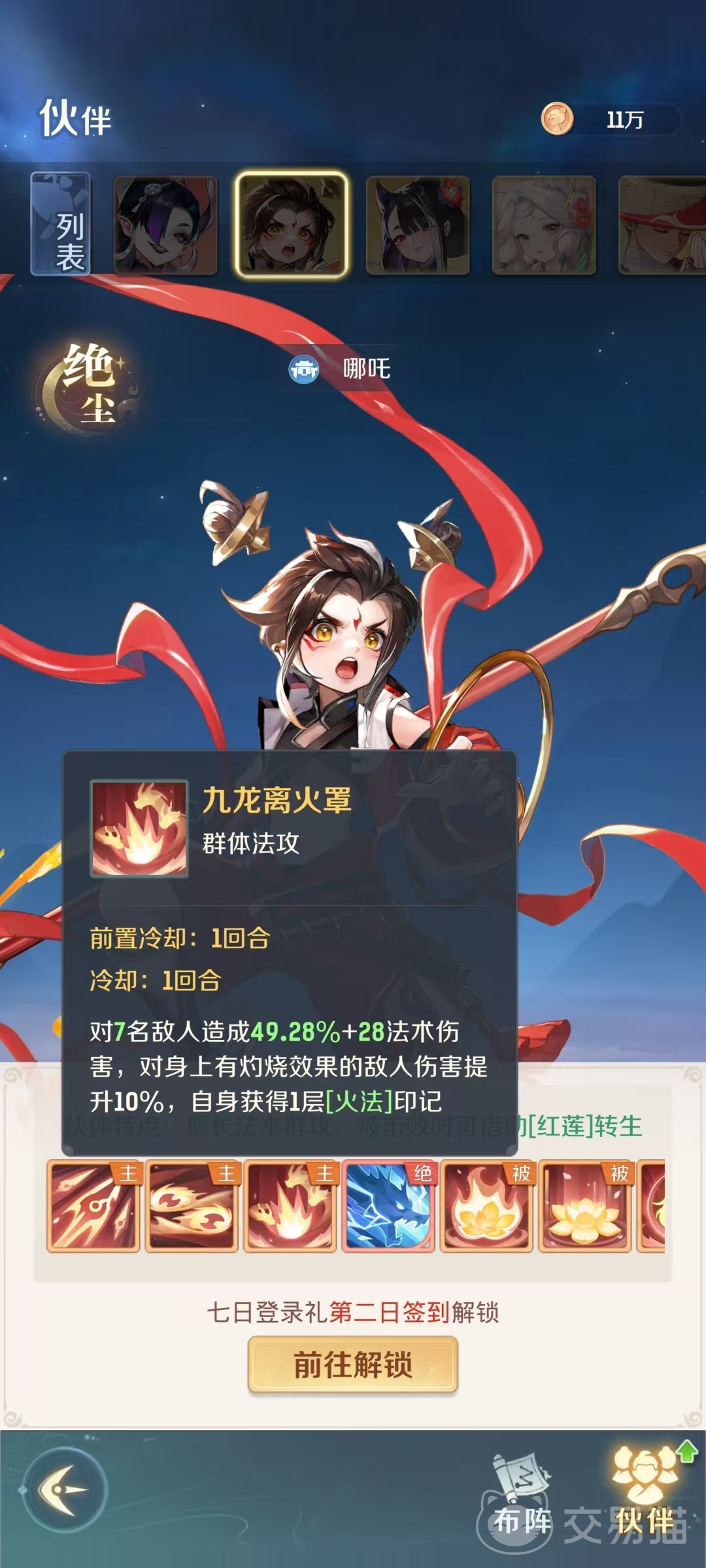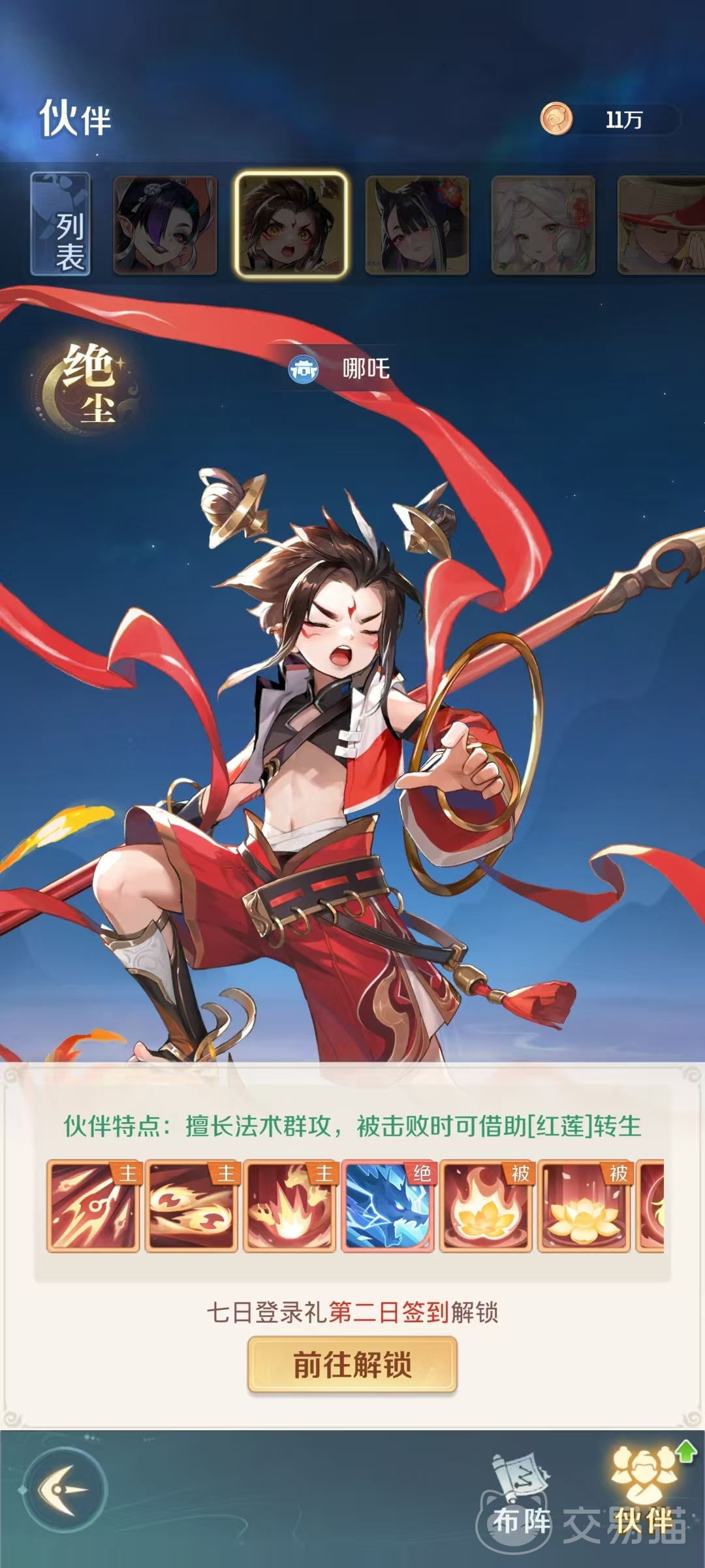 哪咤的获取比较简单,大家只要登录服务器,然后在第2天去7日登录里活动签到,就可以直接解锁了。哪咤是属于绝尘品质的伙伴,虽然比化神要低一些,但依然是前期大家战斗的好帮手。哪咤擅长法术群攻,当被击败时还可以借助红莲转生,这是自身非常有特点的地方。