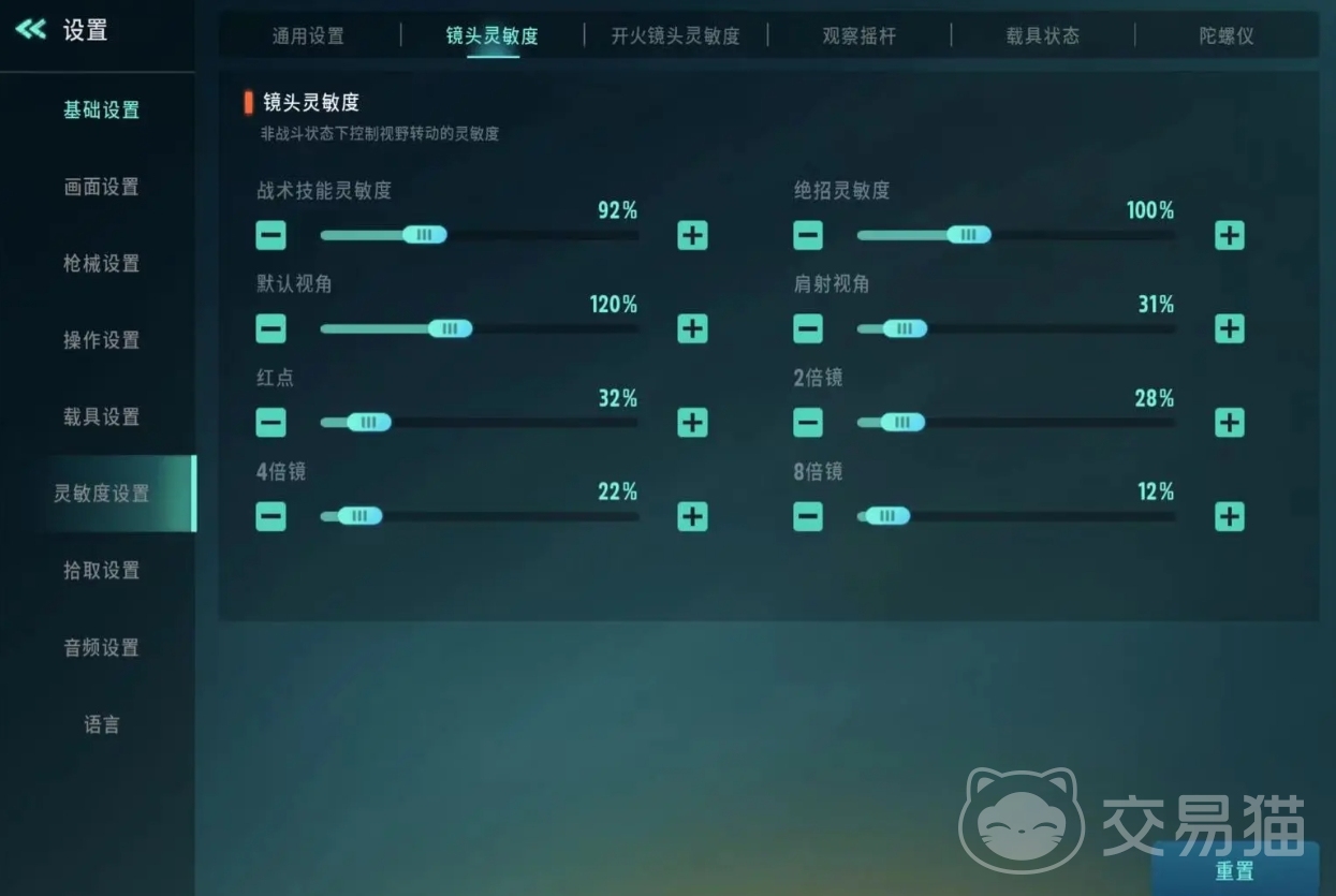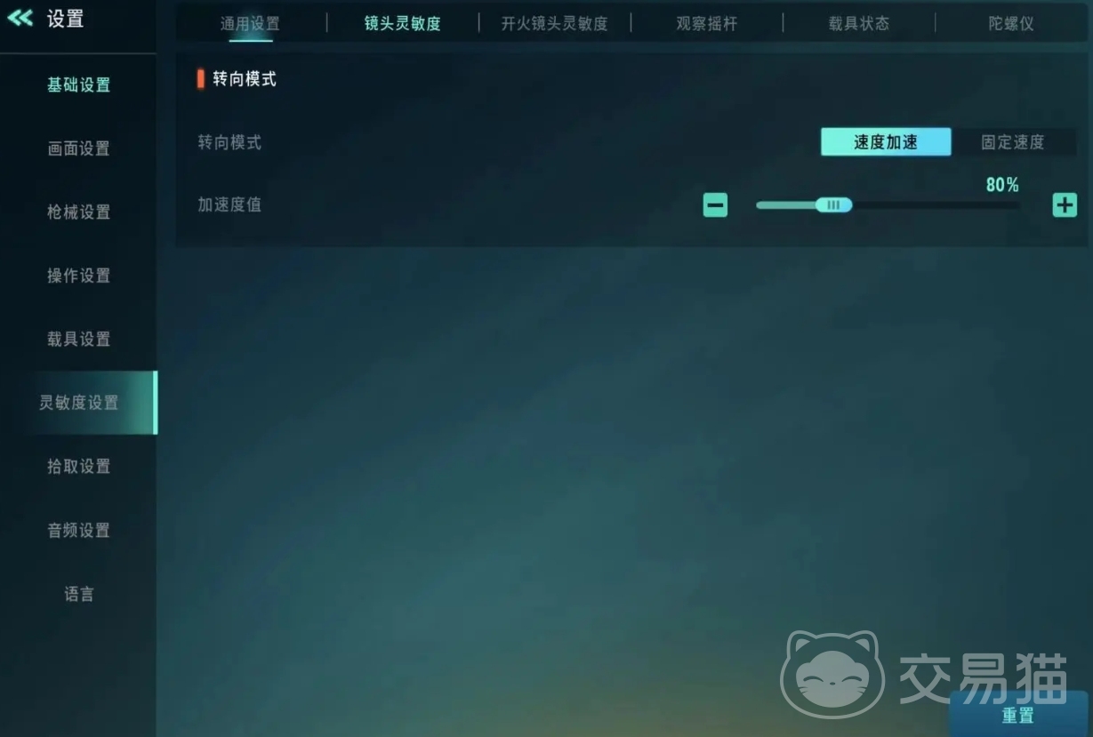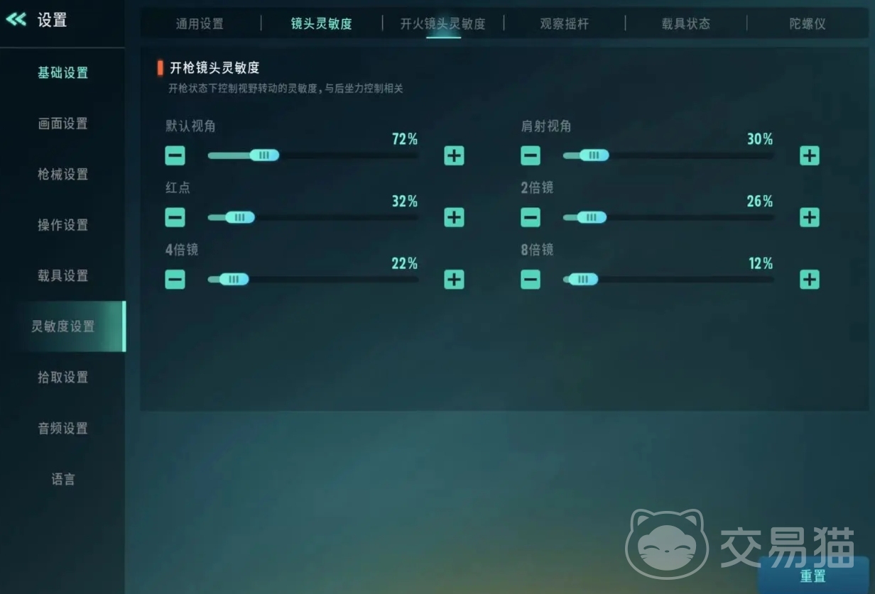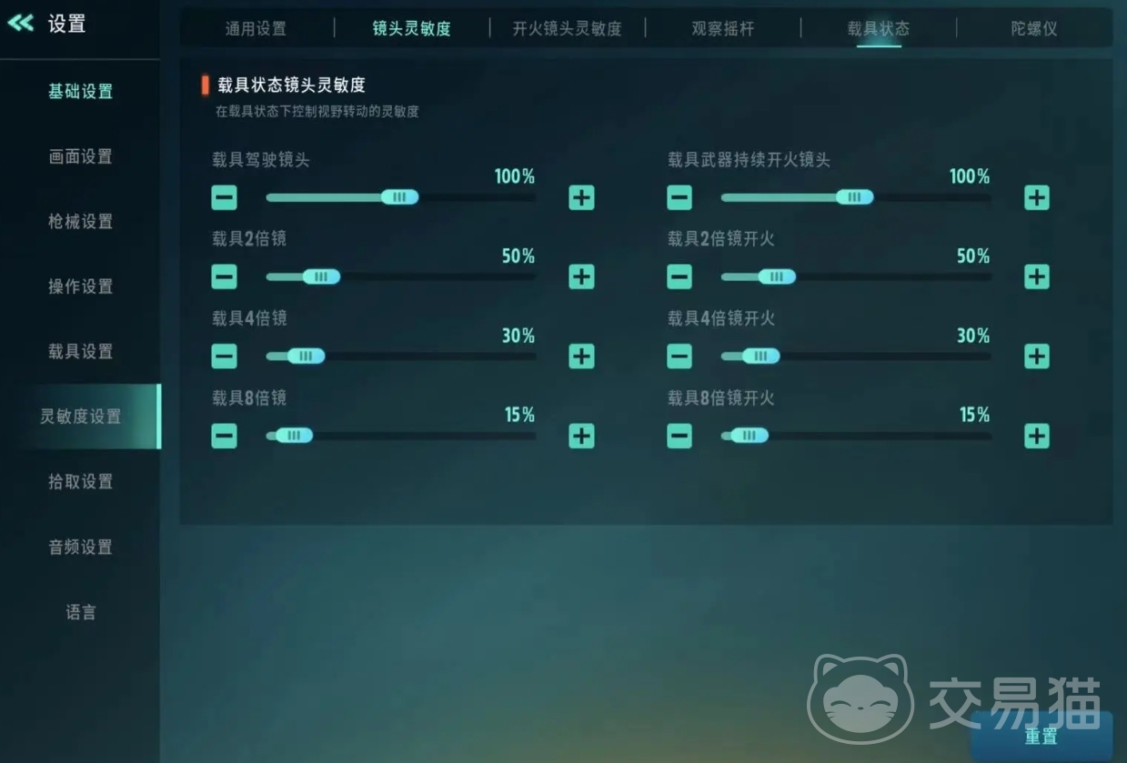 除了上述两点外,玩家们可在载具状态一栏中,调节自己在驾驶载具时所使用的镜头灵敏度。这方面的调节主要看个人的习惯,若玩家觉得默认的灵敏度参数就已经很好用,则可无法再去改动,其它方面的灵敏度设置也是如此。