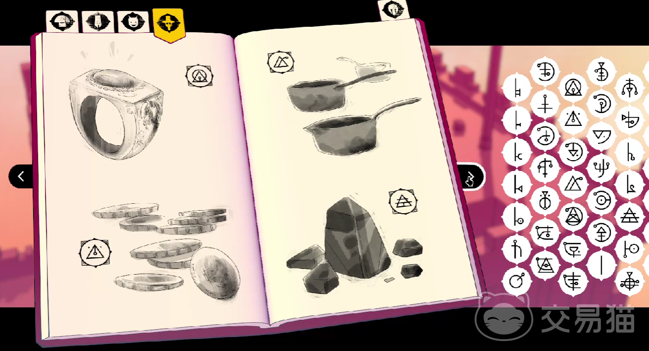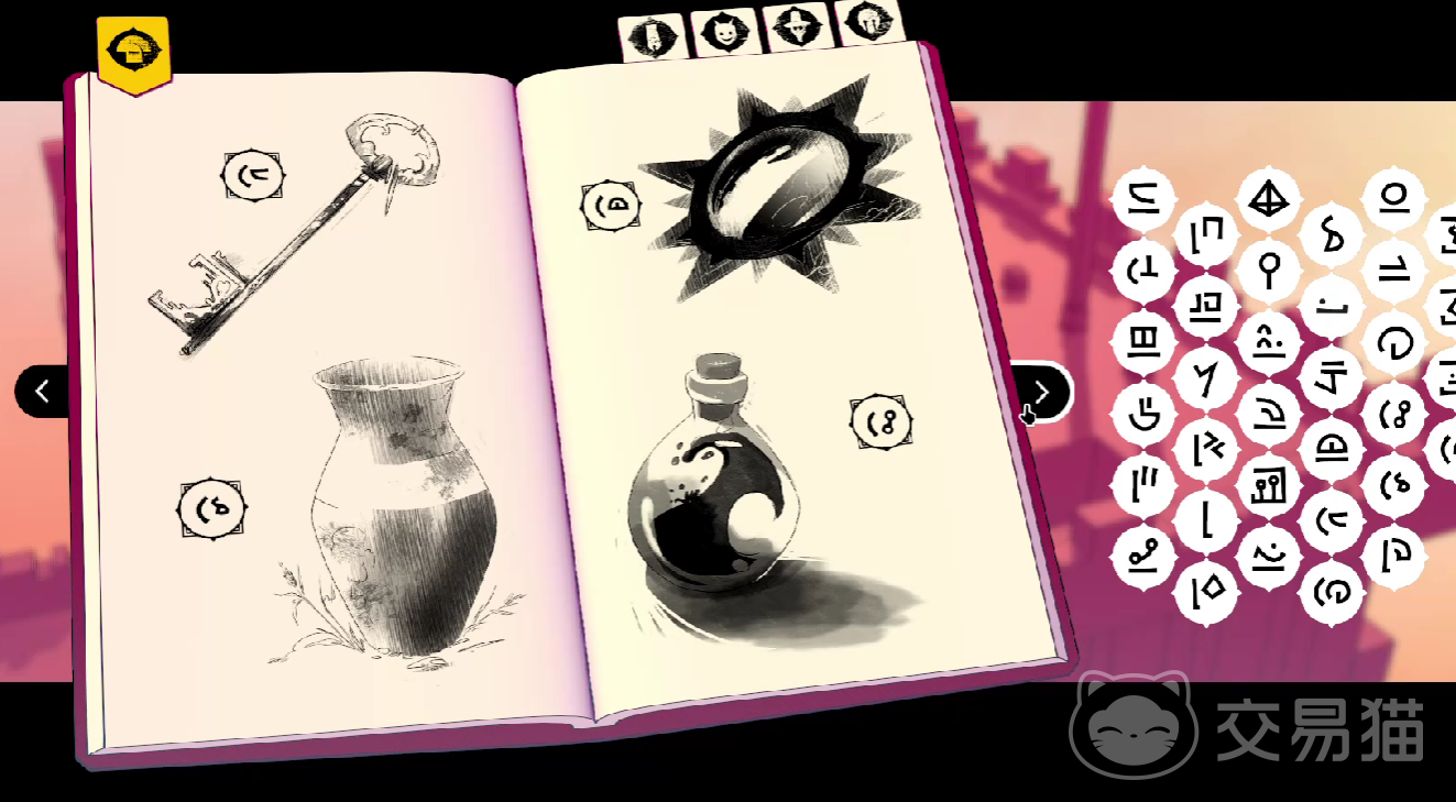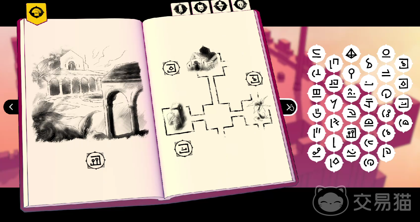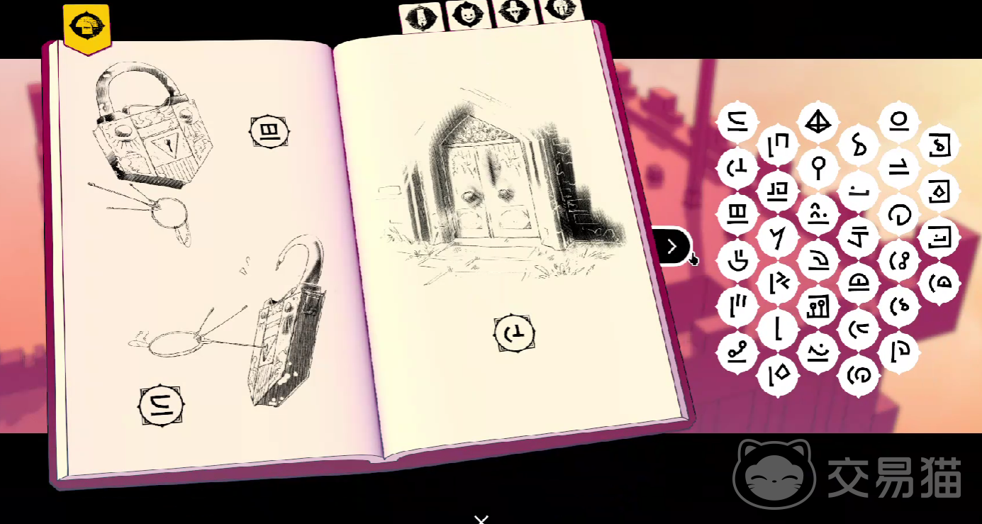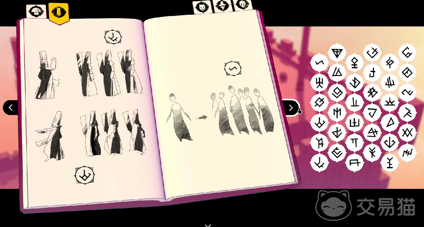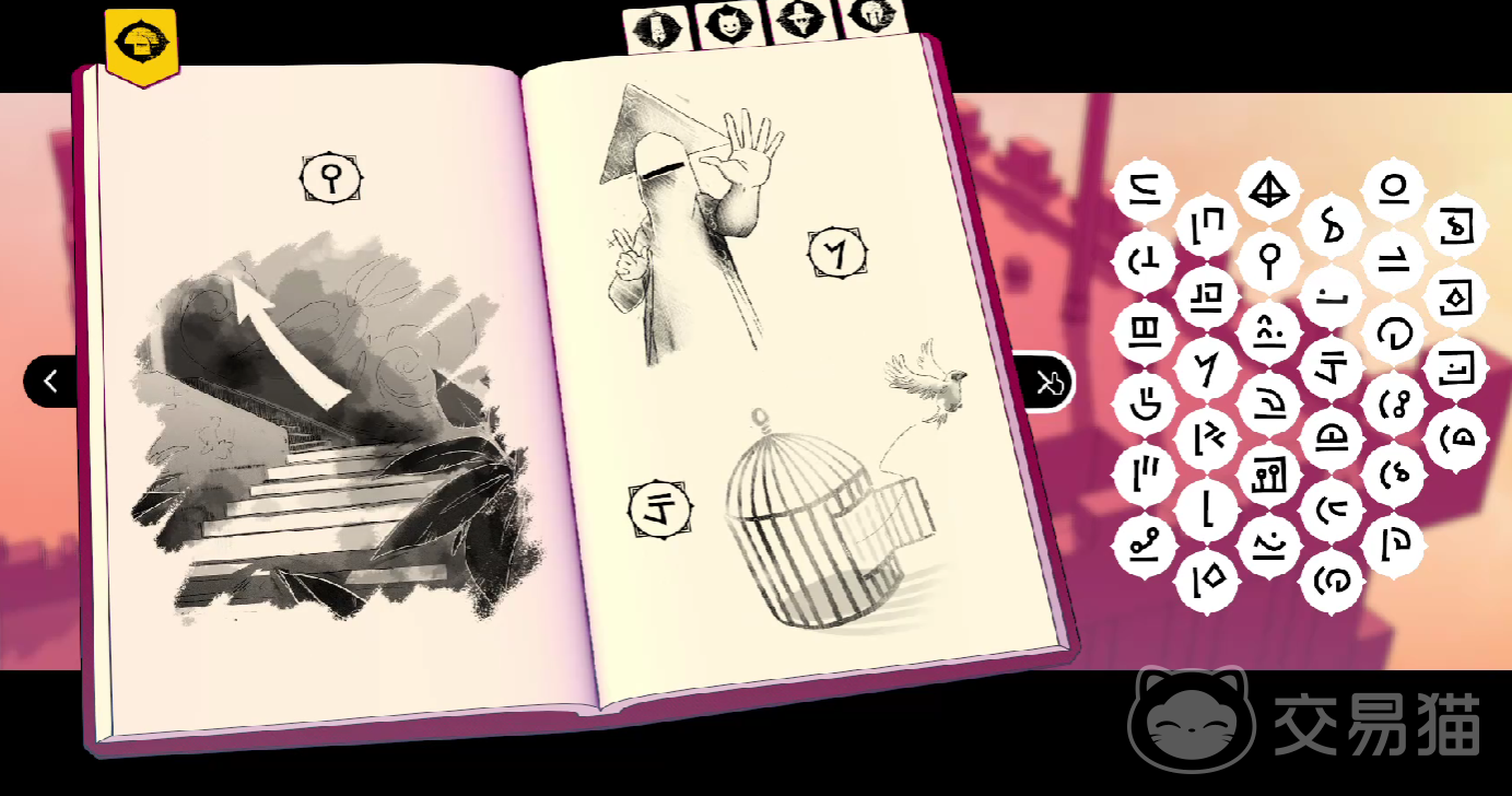 游戏当中的所有人称代词,都是单音节的符号,例如代表我的图标,则是使用“锯齿状的兵器图腾”进行刻画,代表你的图标,则是一条“竖线的弯月”,地点的名词,则会以比较具象化的图标,进行展现,例如熔炉,一定会附带有齿轮和火焰,镜湖一定会附带有,涟漪和月牙。