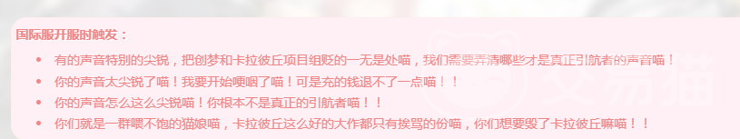 此外,在国际服开服的时候,也有可能会触发一些喵言喵语,有有的时候声音特别的尖锐,有可能就会被贬低的一无是处喵。你的声音怎么这么尖锐喵,你根本就不是一个真正的引航者喵。总之在很多的话后面都会加上喵字,这也就是大家比较喜欢的喵言喵语。