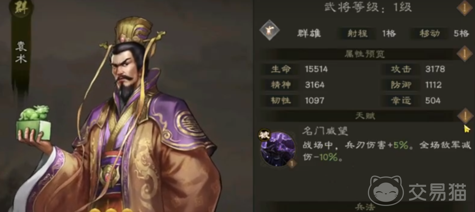 袁术的天赋是在战场上让自己的兵刃伤害加15%,全场敌军的减伤效果减少10%,他的“大赏三军”会让自身获得50点怒气,对周边范围内所有队友施加鼓舞一回合,鼓舞可以让攻击和精神都提升10%,他的怒气技会消耗200怒气,对周围所有敌人造成自身35%精神和攻击的真伤,同时范围内所有单位都能增加50点怒气。