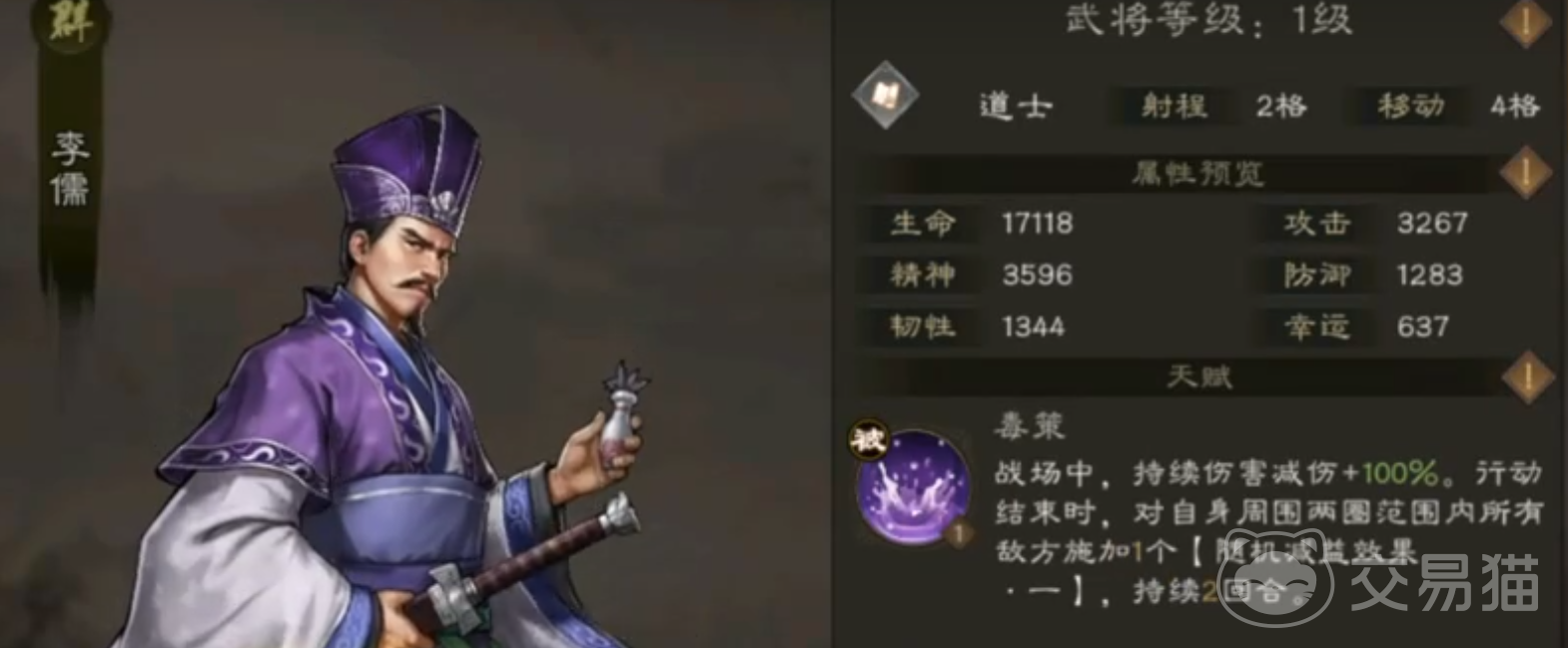 李儒的天赋是在战场中提升100%持续伤害减伤,行动结束时对周围两圈内所有敌人施加随机减益2回合,他的“鸠毒”会对目标及其菱形2格范围内所有敌人造成60%毒系谋略伤,并施加2层鸠毒3回合,该效果会在中招者行动结束时遭受真伤,他的“灭计”会对范围内敌人造成75%毒系伤害,并施加两个随机减益,他的怒气技会对范围内所有敌人造成100%伤,随后附加1层焚烧。