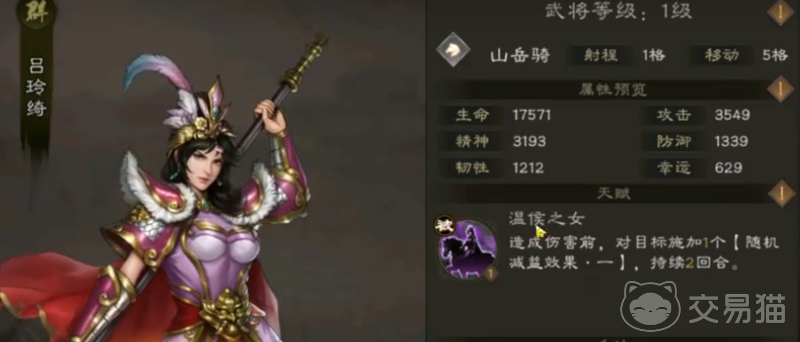 吕玲琦的天赋是在造成伤害前,对目标施加1个随机减益持续2回合,并且在每次形成伤害时,若敌人身上携带减益,就造成5%兵刃伤害,她的“刺心穿透”会在目标每携带1个减益时,让自身获得5%的无视防御,然后对其造成150%近战兵刃伤,她的“战争践踏”会冲撞直线3格内的第一位敌人,造成100%输出后对周边一圈敌人造成30%近战伤,她的怒气技会无视敌方的格挡和闪避造成220%近战兵刃伤。
