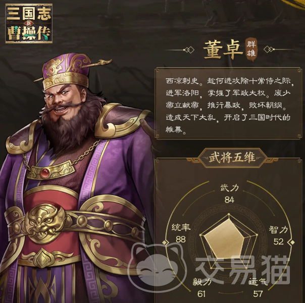 董卓的天赋是在战场上让自己的最大生命提升,不会遭受骑兵的克制,每次行动结束后,若周围一圈内有敌人就扣除自己的部分血量,对他们造成真实伤害并附加1回合流血,他的主动技“逆乱”会造成中量输出值,攻击目标身上每携带一个减益,就会回复自己一部分的生命,他的“天下”会对范围内敌人概率施加嘲讽效果1回合,嘲讽能让敌方强制攻击自己,敌人身上每有1个减益就会让施加概率少量提升,他的怒气技会对目标造成少量近战兵刃伤,并回复自己大比例生命,随后再根据自己当前生命对该敌人造成一次真伤。