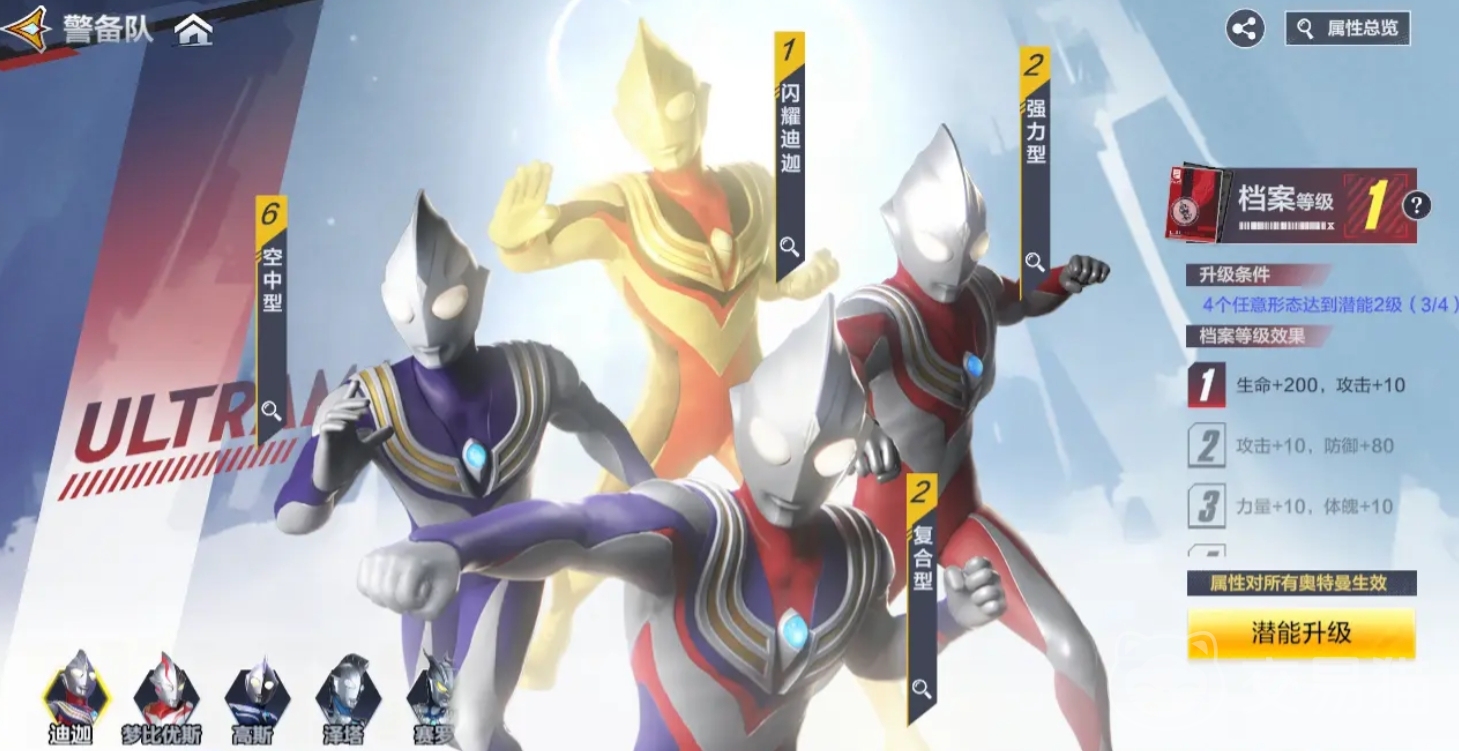 而奥特曼的熟练度提升和晋级,也就是等级的提升以及等阶的突破,这里面可是有着不少门道,玩家们可以通过全员特级手册和专属手册来为奥特曼进行升级,其中警备队勇气训练在整个奥特曼的成长体系中是必须参与的,它的主要作用是通过升级获得的训练点来进行加点操作,这些训练点就只要添加到相应的属性上,就能够为全体奥特曼带来全面的属性加成。