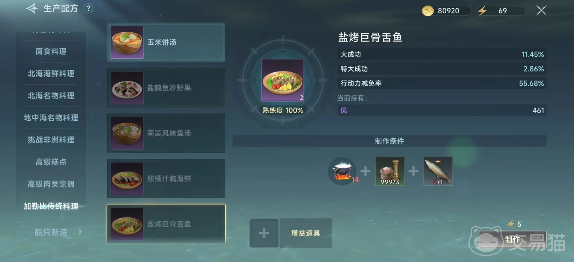 烤巨骨舌鱼:香草盐×3 + 巨骨舌鱼×1