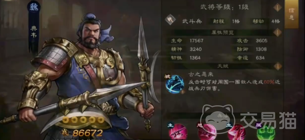 典韦这个武将一般都是作为坦克来使用的,但这并不就不能说明该角色不厉害,实际上他也是魏国非常强势的武将。主动技能“逐虎跃涧”,立刻跳到指定的位置,随后对周围一圈范围内所有敌方造成70%近战兵刃伤害,并添加延续2回合的“缓兵”效果,如果目标已经被赋予了缓兵效果,则给敌人附加持续1回合的“禁足”效果,还会根据连击率额外造成一段50%的伤害,本身这种技能效果就非常不错,而在和夏侯搭配使用的情况下,还能提高该武将打出的伤害。作为团战的杀手,反击和群伤能力还是很强的,更为适合在PVE当中使用。