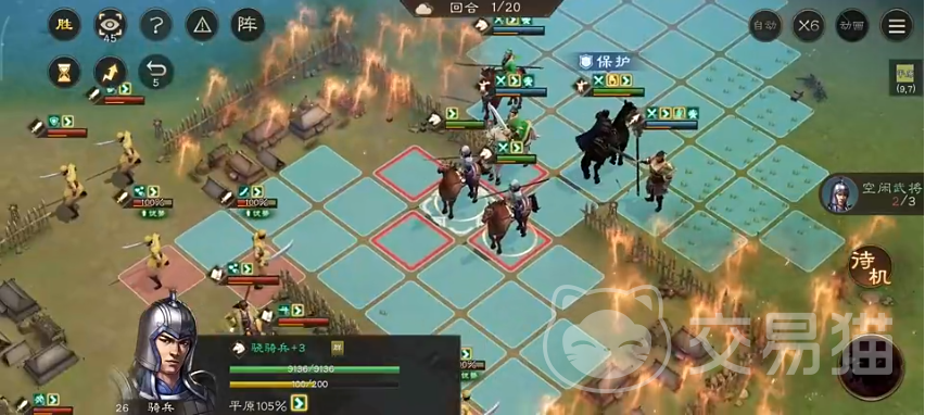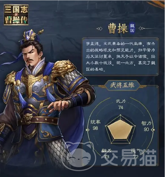 主动技能1“六龙乘风”,对范围内所有友方施加持续3回合的“鼓舞”、“疾行”、“连击”效果。主动技能2“黄天之剑”,对敌方单位打出大量的近战兵刃损伤,并复制一个目标的增益,然后将自身携带的减益buff转移到该目标身上。怒气技能“天下归心”,对自身菱形两格范围内,所有友方赋予2回合的“霸王”效果,之后对范围内所有敌方目标打出少量的谋略伤害。属性“统帅”,全属性、生命上限得到少量提升,兵刃减免,被疗效果提升重量。可看出曹操是个辅助型的武将,能给队伍整体带来各种良好的增益buff,提升队伍整体的输出能力。
